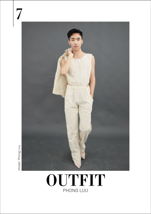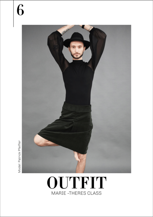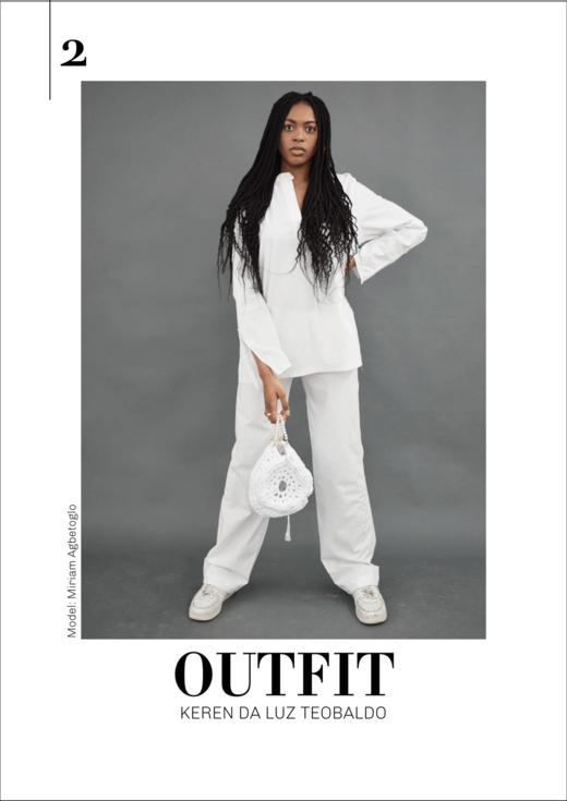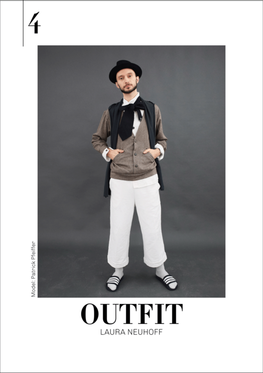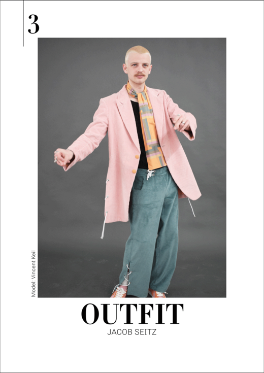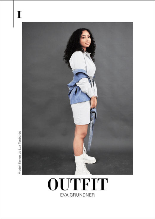 Die Kollektion setzt sich aus einzelnen, jeweils von den Teilnehmer*innen des Moduls entworfenen Outfits zusammen. Die einzelnen Outfits an sich verweisen dabei auf die Macher*innen selbst. Sie spiegeln beispielsweise deren Herkunft genauso wie sie prägende Einflüsse und Eindrücke wider. So wurden etwa Verweise auf die eigenen brasilianischen Wurzeln – die weißen Gewänder der Capoeiratänzer – eingebaut, der Look der 1970er-Jahre neu interpretiert oder mit umweltfreundlichen Stoffen gearbeitet. Und auch ein Home-Office-Look durfte angesichts des Lockdowns natürlich nicht fehlen.