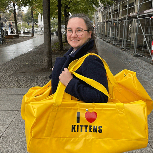 Es klingt fast wie im Märchen, was der 31-Jährigen Franziska Maier passiert ist: Plötzlich klopfte Hollywood an die Tür der jungen Modedesignerin und winkte mit einem Auftrag. Doch halt, beginnen wir von vorn. Franziska Maier gehört zu den Menschen, die eine eigene Vorstellung davon haben, wie man das Leben gestalten kann. Schon während ihrer Ausbildung zur Modedesignerin an der Modefachschule Sigmaringen etwa – sie hatte dort mit null Grundkenntnissen angefangen – begann sie damit Taschen zu nähen. Das hatte einen ganz praktischen Hintergrund. Die Taschen, die es zu kaufen gab und die ihr gefielen, lagen jenseits ihres Budgets. Also entwarf und nähte sie sich ganz einfach selbst. Und obwohl es nicht Teil der Aufgabenstellung war, fertigte sie auch für ihre Abschlusskollektion fogelfrei gleich vier Taschen an. Das Thema Taschen zog sich also fast wie ein roter Faden durch ihre drei Ausbildungsjahre und sollte sie auch weiterhin begleiten. Im Sommer 2013 hängte Franziska Maier an die Modedesigner-Ausbildung noch eine Ausbildung als Feintäschnerin dran. Das Vorwissen aus der Zeit an der Modefachschule – Entwerfen, Schnitttechnik, Materialkunde, Nähen und so weiter – war da sehr hilfreich. Nach dieser zweiten Ausbildung arbeitete Franziska Maier erst einmal in ganz verschiedenen Bereichen. Beispielsweise als Stylistin, als Praktikantin im Kostümbild bei einem Til-Schweiger-Film oder als Regieassistentin in der ARD-Produktion Scheidung für Anfänger mit Andrea Sawatzki und Christian Berkel. Zuletzt war sie in einem Büro als Assistentin angestellt, hatte also gar nichts mehr mit Mode, geschweige denn mit Taschen zu tun. Den Traum von der Selbständigkeit aber, den trug sie noch immer mit sich herum. Dass es zu dem Auftrag für den Action-Thriller Gunpowder Milkshake kam, hatte sie dem Zufall und schon bestehenden Kontakten in die Filmbranche, genauer zu den Babelsberger Filmstudios in Potsdam, zu verdanken: Der Requisiteur der ARD-Produktion rief im Frühjahr 2019 bei ihr an und fragte sie, ob sie aus LKW-Planen knallgelbe Weekender für den Film anfertigen könnte. Die Hauptdarstellerin Karen Gillan würde darin Waffen transportieren. Zusätzlich zu den Taschen mit der Aufschrift I love kittens sollte Franziska Maier außerdem zwanzig gelbe Leichensäcke nähen. Wegen einer Drehplanänderung musste das quasi über Nacht geschehen. Fast 36 Stunden am Stück saß Franziska Maier an der Nähmaschine und legte nur kurz Pausen ein, um etwas zu essen. Aber die Anstrengung hat sich gelohnt. Eine der Taschen, die sie genäht hat, wird auch auf dem Filmplakat gezeigt, das beim Filmstart in den USA im Juli 2021 als Leuchtreklame am berühmten Time Square in New York zu sehen war. „Dieser tolle Auftrag und die Tatsache, dass ich in meinem Bürojob im April 2020 aufgrund von Corona in Kurzarbeit geschickt und auf null Prozent gesetzt wurde, gab mir den noch nötigen Stoß, um endlich den Schritt in die Selbständigkeit zu machen“, erzählt Franziska. Plötzlich sei ihr klar geworden, dass eine Festanstellung nicht so sicher ist, wie es ihr immer gesagt wurde. Und dass es manchmal viel wichtiger sei, endlich seinen Träumen zu folgen und ins kalte Wasser zu springen.