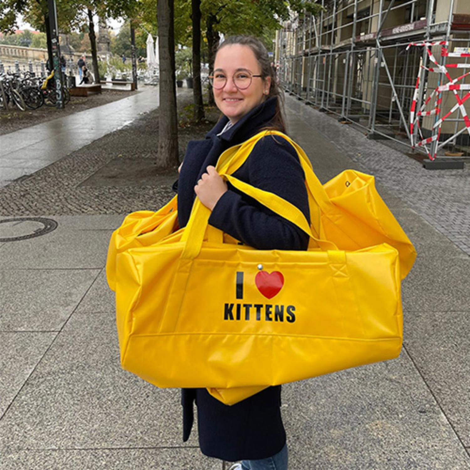 Dass es zu dem Auftrag für den Action-Thriller Gunpowder Milkshake kam, habe ich dem Zufall und schon bestehenden Kontakten in die Filmbranche, genauer zu den Babelsberger Filmstudios in Potsdam, zu verdanken: Der Requisiteur der ARD-Produktion rief im Frühjahr 2019 bei mir an und fragte mich, ob ich aus LKW-Planen knallgelbe Weekender für den Film anfertigen könnte. Die Hauptdarstellerin Karen Gillan würde darin Waffen transportieren. Zusätzlich zu den Taschen mit der Aufschrift I love kittens sollte ich außerdem zwanzig gelbe Leichensäcke nähen. Wegen einer Drehplanänderung musste das quasi über Nacht geschehen. Ich saß fast 36 Stunden am Stück an der Nähmaschine und habe nur kurz Pausen eingelegt, um etwas zu essen. Aber die Anstrengung hat sich gelohnt. Eine der Taschen, die ich genäht habe, wird auch auf dem Filmplakat gezeigt, das beim Filmstart in den USA im Juli 2021 als Leuchtreklame am berühmten Time Square in New York zu sehen war.