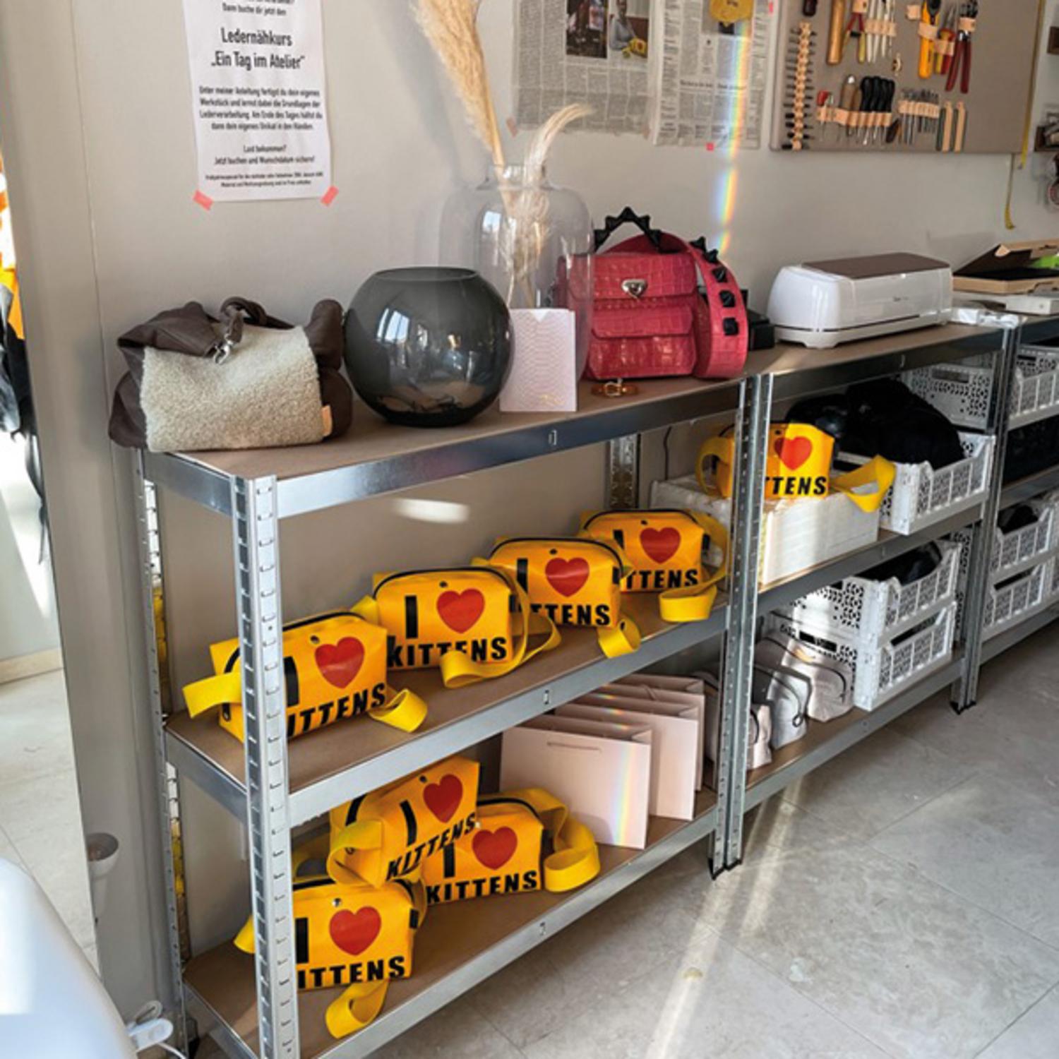 „Schon während meiner Ausbildung zur Modedesignerin an der Modefachschule Sigmaringen – ich hatte dort mit null Grundkenntnissen angefangen – begann ich damit Taschen zu nähen. Das hatte einen ganz praktischen Hintergrund: Die Taschen, die es zu kaufen gab und die mir gefielen, lagen jenseits meines Budgets. Also entwarf und nähte ich sie mir ganz einfach selbst. Obwohl es nicht Teil der Aufgabenstellung war, fertigte ich auch für meine Abschlusskollektion fogelfrei gleich vier Taschen an. Das Thema Taschen zog sich also fast wie ein roter Faden durch meine drei Ausbildungsjahre und sollte mich auch weiterhin begleiten. Im Sommer 2013 hängte ich an die Modedesigner-Ausbildung noch eine Ausbildung als Feintäschnerin dran. Das Vorwissen aus der Zeit an der Modefachschule – Entwerfen, Schnitttechnik, Materialkunde, Nähen und so weiter – war da sehr hilfreich. Nach dieser zweiten Ausbildung arbeitete ich erst einmal in ganz verschiedenen Bereichen. Beispielsweise als Stylistin, als Praktikantin im Kostümbild bei einem Til-Schweiger-Film oder als Regieassistentin in der ARD-Produktion Scheidung für Anfänger mit Andrea Sawatzki und Christian Berkel. Zuletzt war ich in einem Büro als Assistentin angestellt, hatte also gar nichts mehr mit Mode, geschweige denn mit Taschen zu tun. Den Traum von der Selbständigkeit aber, den trug ich noch immer mit mir herum.